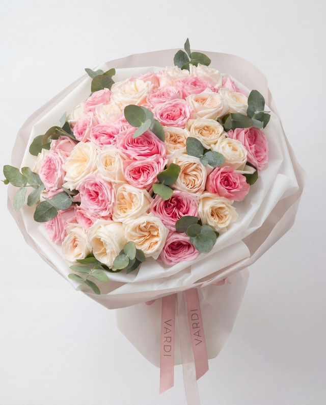 Blush Éternel erzählt von Zärtlichkeit und Verbundenheit. White O’Hara und Pink O’Hara Rosen verschmelzen zu einem Meer aus Creme und Rosé – wie ein stiller Dialog zwischen Reinheit und Gefühl. Der feine Eukalyptus legt sich sanft um die Blüten und verleiht dem Bouquet eine natürliche Leichtigkeit.