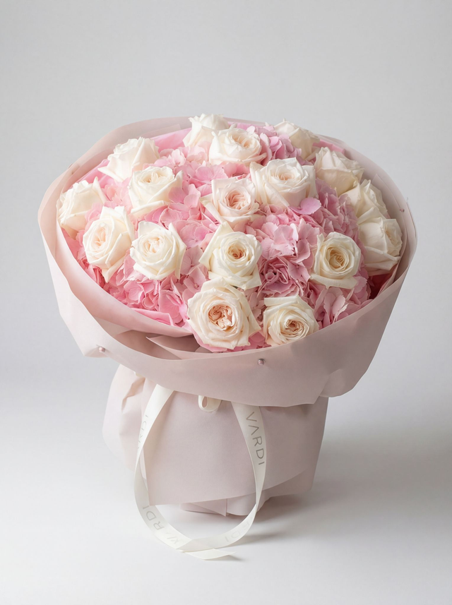 Blush Eternity wirkt wie ein sanfter Sonnenaufgang in Rosé. Üppige rosa Hortensien bilden ein weiches Blütenbett, aus dem edle White O’Hara Rosen wie helle Sterne hervorleuchten. Die Kombination aus zarter Fülle und klarer Eleganz schafft eine ruhige, intime Atmosphäre — ein Bouquet, das Nähe, Geborgenheit und leise Romantik ausstrahlt. Perfekt für einen Moment, in dem Gefühle ohne große Worte gezeigt werden sollen.