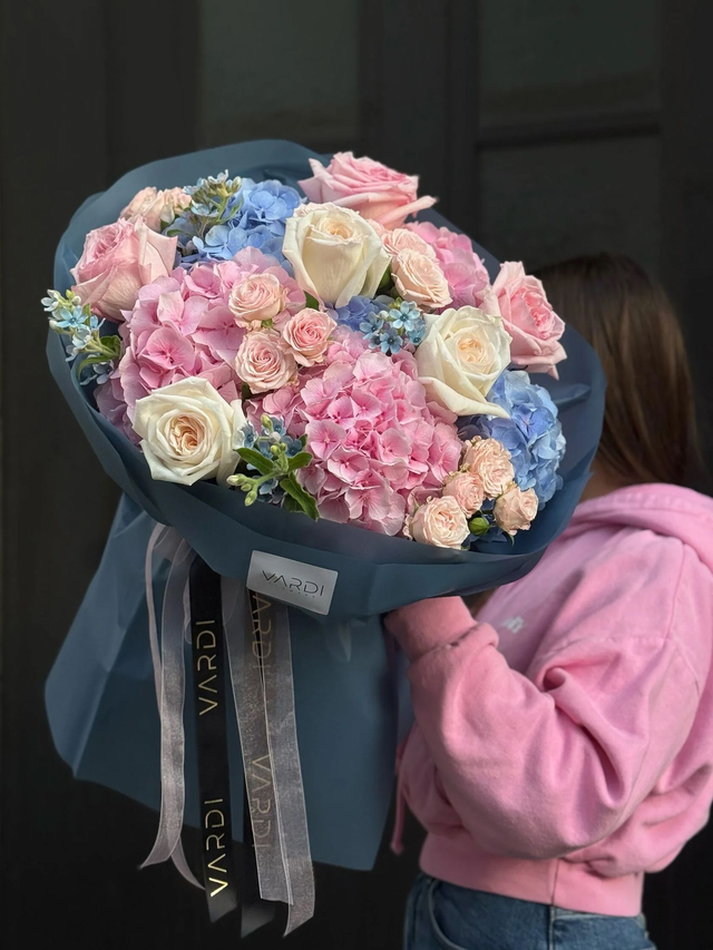 monaco dusk verbindet kühle Blautöne mit zartem Rosé zu einem eleganten, ausbalancierten Arrangement. Rosa und blaue Hortensien bilden die voluminöse Basis, ergänzt durch Ohara-Rosen in Weiß und Pink, feine verzweigte Aerobic-Rosen und dezentes Oxypetalum. Die mattblaue Verpackung mit schwarzem und roséfarbenem VARDI-Seidenband verleiht dem Bouquet eine moderne, urbane Eleganz – stilvoll, ruhig und außergewöhnlich.
