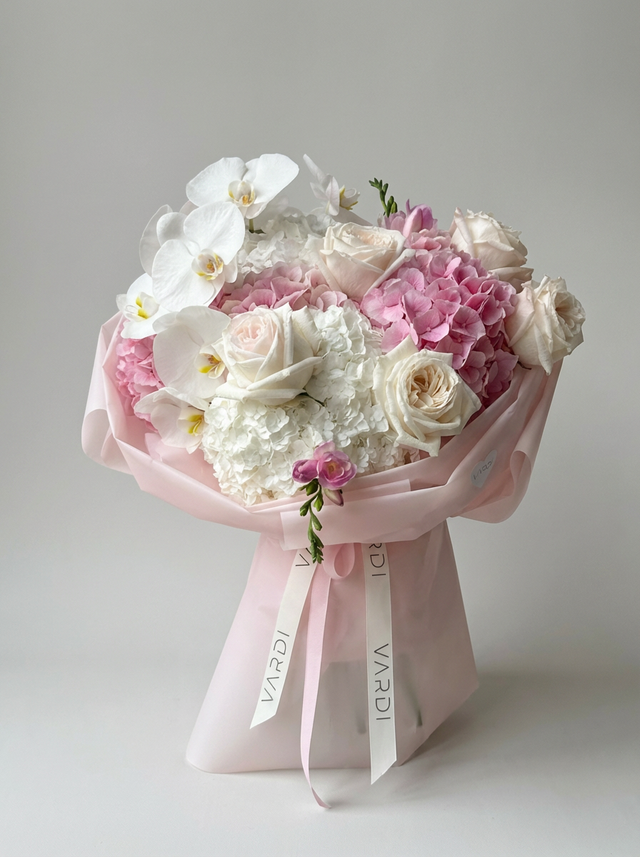 „Parisian“ steht für Romantik, Anmut und zeitlose Ästhetik. Ein zartes Couture-Bouquet in Rosé und Cremeweiß, inspiriert von klassischer Pariser Eleganz. Weiche Hortensien in Weiß und Rosa bilden das Volumen, White O’Hara Rosen setzen ruhige, luxuriöse Akzente, während Phalaenopsis dem Bouquet Leichtigkeit und Bewegung verleihen. Die Linien wirken weich, feminin und modern – ein Arrangement, das nicht laut ist, sondern stilvoll flüstert.