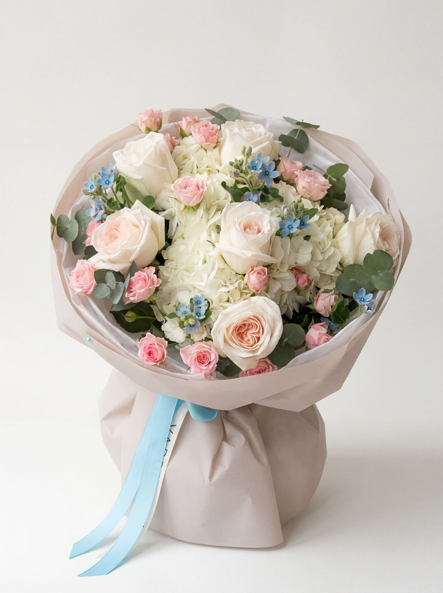 Zarte weiße Hortensien bilden eine weiche, wolkige Basis, durchzogen von himmelblauem Oxypetalum, das dem Bouquet eine poetische Leichtigkeit verleiht. Rosa Aerobic Rosen setzen warme Akzente wie errötete Gedanken, während feiner Eukalyptus eine ruhige, natürliche Frische hineinbringt.Die rosa-beige Verpackung umhüllt die Komposition wie ein sanfter Schleier, ergänzt durch die blaue Schleife als eleganter Kontrast – eine Farbmelodie aus Romantik, Ruhe und moderner Zartheit.