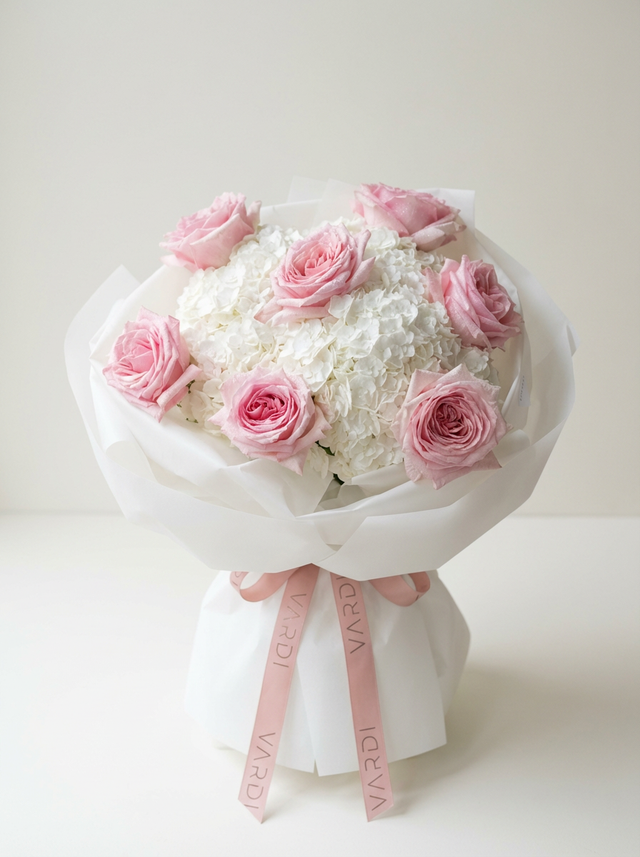 „Rosé Cloud“ wirkt wie ein stiller Moment zwischen zwei Herzschlägen. Weiche, schneeweiße Hortensien formen eine wolkenartige Basis, aus der zarte Pink O’Hara Rosen wie errötete Gedanken hervorblühen. Die Komposition strahlt Ruhe, Reinheit und leise Romantik aus – ein Bouquet, das nicht laut spricht, sondern sanft berührt. Die schneeweiße Verpackung unterstreicht die Klarheit des Designs, während das rosafarbene VARDI-Seidenband einen femininen Akzent setzt. „Rosé Cloud“ ist eine Geste voller Zärtlichkeit – für Gefühle, die man nicht erklären muss.