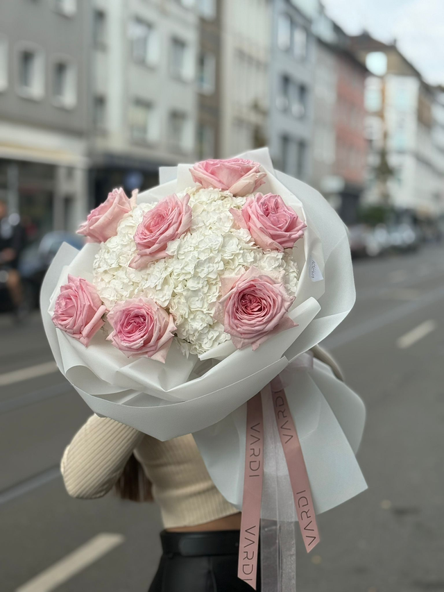 Das Bouquet „rose cloud“ besteht aus 7 Pink O’Hara Rosen aus Ecuador und 5 weißen Hortensien, locker und luftig in weißer Premium-Verpackung arrangiert. Die Kombination aus großköpfigen Rosen und voluminösen Hortensien verleiht dem Bouquet eine weiche, elegante Ausstrahlung – ruhig, feminin und hochwertig.
